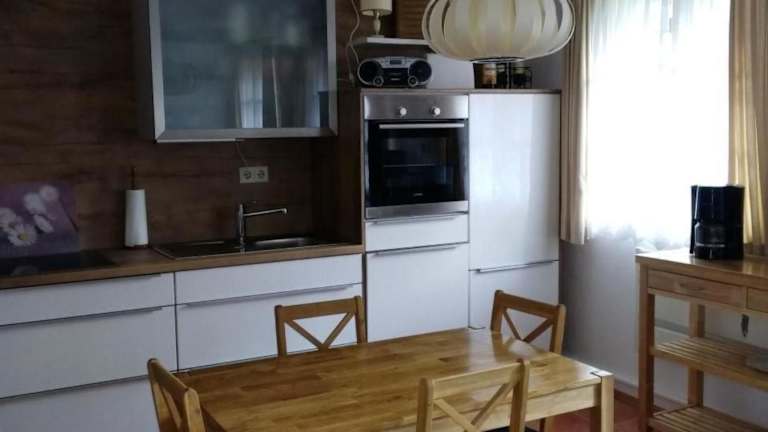 Die Küchenzeile in der Wohnung ist ausgestattet mit einem Kühlschrank, einem Geschirrspüler, einem Ofen, einer Kaffeemaschine und einem Wasserkocher, was eine Selbstverpflegung ermöglicht.
