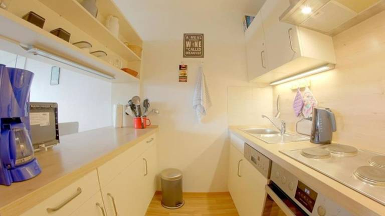 Die Ferienwohnung umfasst zwei Schlafzimmer, ein Wohnzimmer mit Flachbild-TV, eine gut ausgestattete Küche mit Kühlschrank und Geschirrspüler sowie ein Badezimmer mit Dusche. Ein Balkon mit Bergblick ist ebenfalls vorhanden. Handtücher und Bettwäsche werden bereitgestellt.