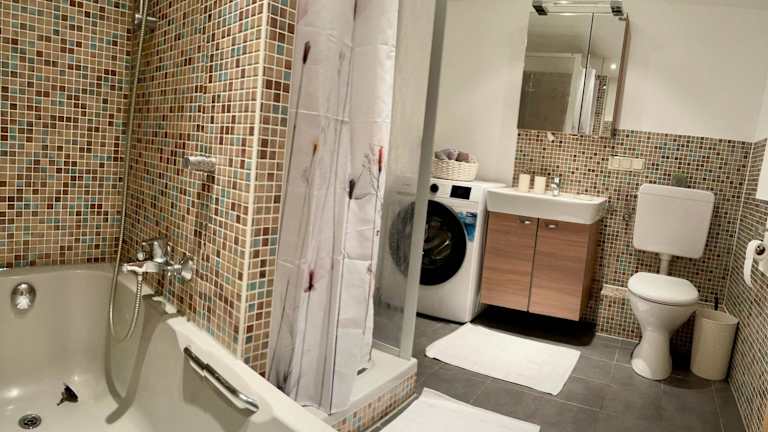 Die Ferienwohnung umfasst ein Schlafzimmer, ein Wohnzimmer mit Flachbild-TV, eine gut ausgestattete Küche mit Kühlschrank und Geschirrspüler sowie ein Badezimmer mit Dusche. Handtücher und Bettwäsche werden bereitgestellt. Die Aussicht von der Terrasse und dem Garten ist besonders hervorzuheben.