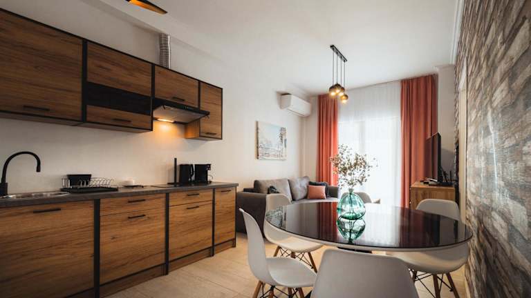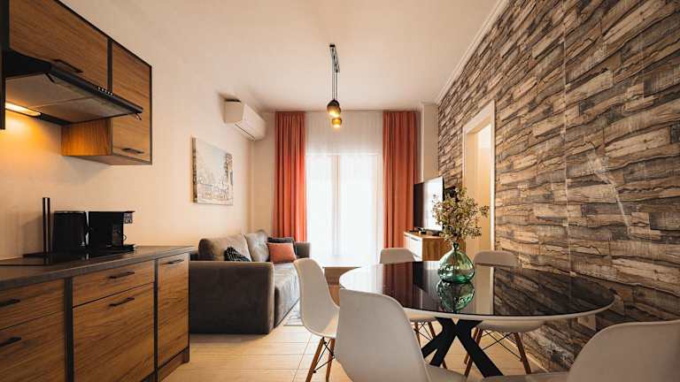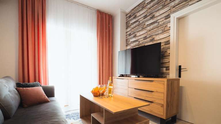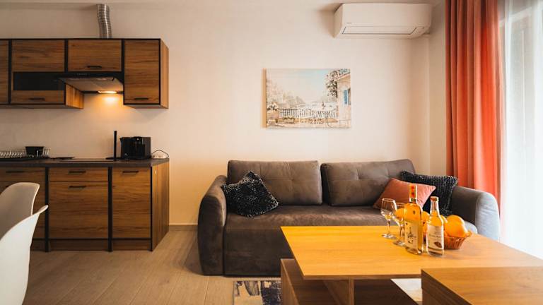 Die Ferienwohnung ist klimatisiert und besteht aus zwei Schlafzimmern sowie einem Wohnzimmer. Eine voll ausgestattete Küche mit Kühlschrank und Kaffeemaschine ist vorhanden. Das Badezimmer verfügt über ein Bidet und eine Dusche. Handtücher und Bettwäsche werden bereitgestellt.