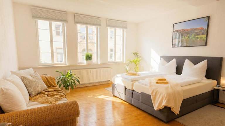 Apartment DOM III - Erfurt Domplatz ist eine Ferienwohnung in einem historischen Gebäude aus dem Jahr 1700. Die Unterkunft ist mit kostenlosem WLAN ausgestattet und bietet einen Stadtblick. Zudem werden Handtücher und Bettwäsche bereitgestellt.