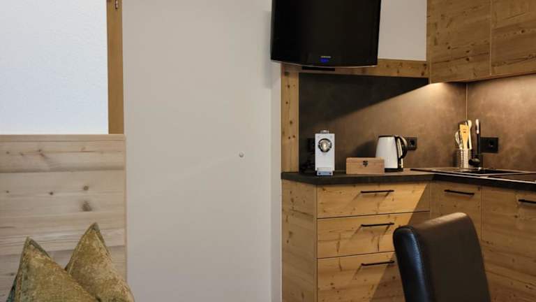 Das Apart Heim bietet ein geräumiges Apartment mit einem Schlafzimmer und einem kombinierten Wohnzimmer mit einer Küche, einem Essbereich und einem Schlafsofa. Das Apartment ist im modernen alpenländischen Stil eingerichtet und verfügt über Holzmöbel und -böden. Es gibt auch ein Badezimmer sowie eine Terrasse im Erdgeschoss und einen Balkon auf der oberen Etage, die beide einen herrlichen Blick auf die Zillertaler Alpen bieten.