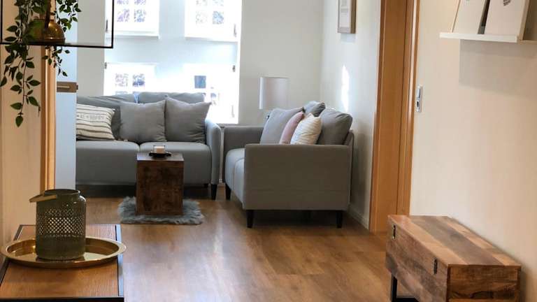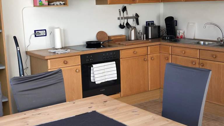 Die Ferienwohnung besteht aus zwei Schlafzimmern, einem Wohnzimmer sowie einer voll ausgestatteten Küche mit Kühlschrank und Kaffeemaschine. Ein Badezimmer mit Dusche und Haartrockner ist ebenfalls vorhanden. Handtücher und Bettwäsche werden bereitgestellt.