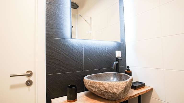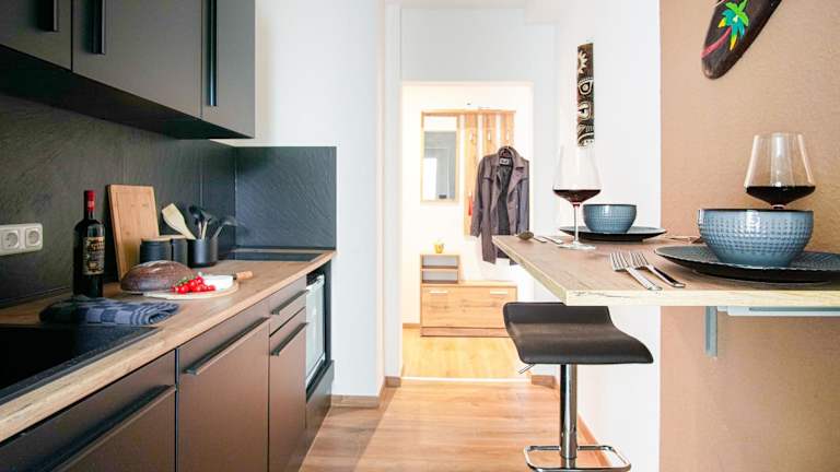Die Ferienwohnung umfasst ein Schlafzimmer, ein Wohnzimmer sowie eine voll ausgestattete Küche mit Kühlschrank und Kaffeemaschine. Ein Badezimmer mit Dusche und kostenlosen Pflegeprodukten ist ebenfalls vorhanden. Handtücher und Bettwäsche werden bereitgestellt.