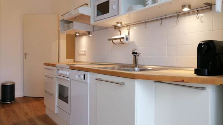 Die eigene Küche ist mit einem Kühlschrank, einem Ofen, einer Mikrowelle, einer Herdplatte, einem Toaster, einer Kaffeemaschine und einem Wasserkocher ausgestattet.