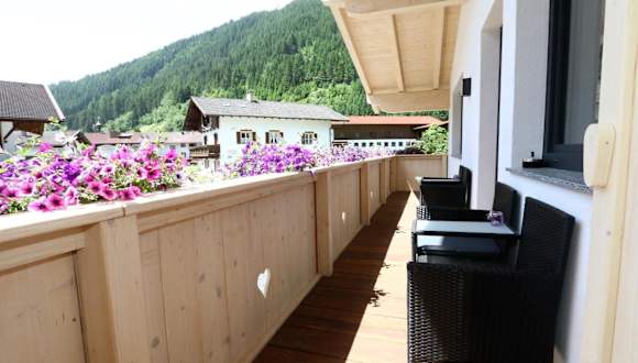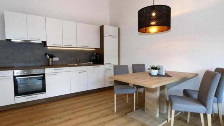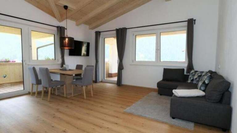 Die Ferienwohnung umfasst zwei Schlafzimmer, ein Wohnzimmer mit TV, eine gut ausgestattete Küche mit Kühlschrank und Geschirrspüler sowie zwei Badezimmer mit Dusche. Ein Balkon mit Bergblick ist ebenfalls vorhanden.