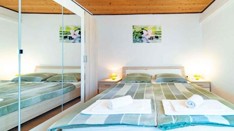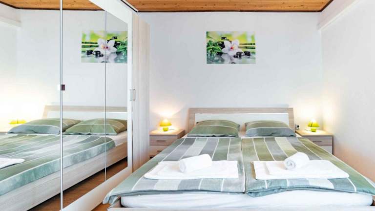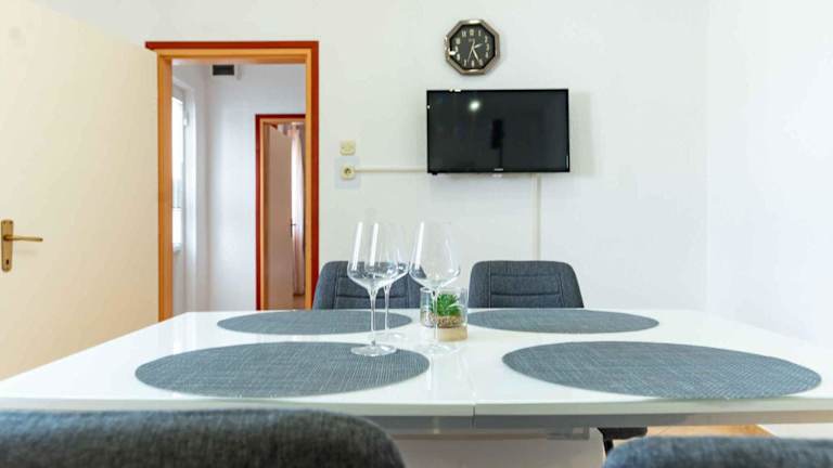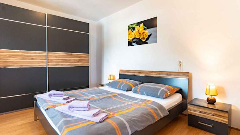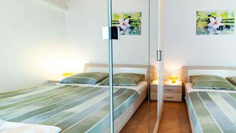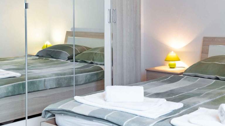 Das Apartment verfügt über zwei Schlafzimmer und bietet somit ausreichend Platz für eine kleine Familie oder eine Gruppe von Freunden. Die Küchenzeile ist mit einem Kühlschrank, einem Geschirrspüler und einer Kaffeemaschine ausgestattet, so dass die Gäste ihre eigenen Mahlzeiten zubereiten können. Ein TV ist ebenfalls vorhanden, um Unterhaltung zu bieten.