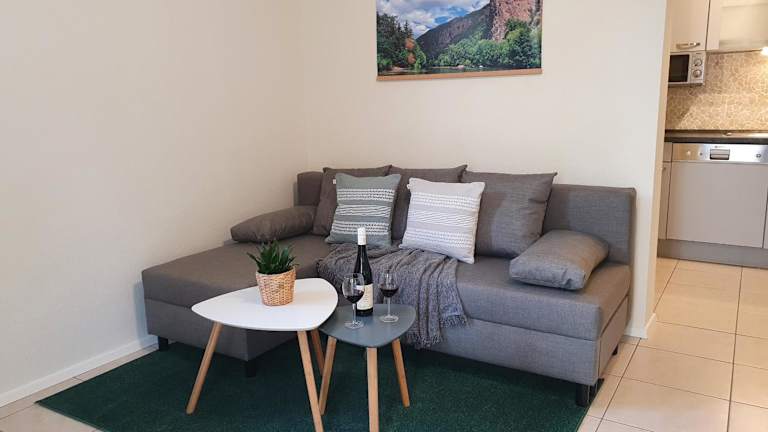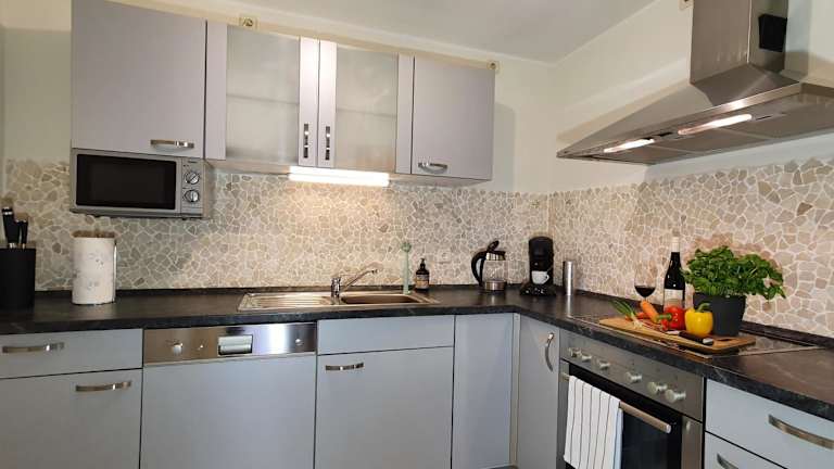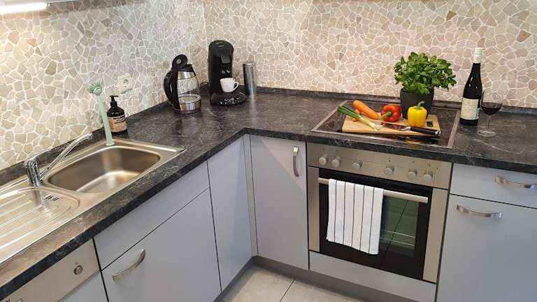 Die Ferienwohnung umfasst ein Schlafzimmer, ein Wohnzimmer sowie eine voll ausgestattete Küche, die mit einem Kühlschrank und einer Kaffeemaschine ausgestattet ist. Des Weiteren gibt es ein Badezimmer, das mit einer Dusche und einem Haartrockner eingerichtet ist. Handtücher und Bettwäsche werden bereitgestellt.