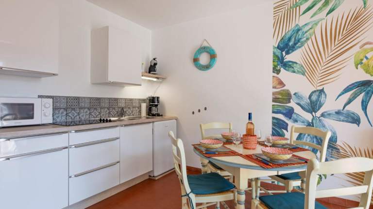 Die Ferienwohnung beinhaltet zwei separate Schlafzimmer und eine voll ausgestattete Küche mit Kühlschrank und Ofen. Zudem steht ein Badezimmer zur Verfügung. Zur Ausstattung gehören auch ein TV sowie eine Klimaanlage.