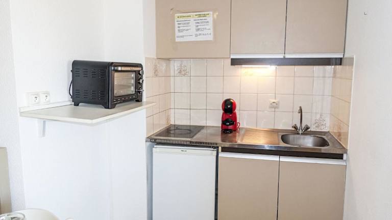Das Apartment ist ausgestattet mit einem Schlafzimmer, einem Wohnzimmer, einem Fernseher und einer gut ausgestatteten Küchenzeile, die sowohl über einen Kühlschrank als auch einen Ofen verfügt. Des Weiteren gibt es ein Badezimmer mit Dusche. Handtücher und Bettwäsche können gegen Gebühr gemietet oder selbst mitgebracht werden.