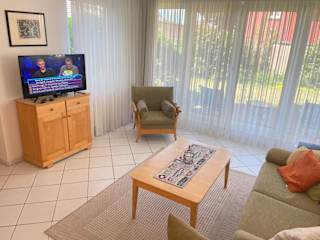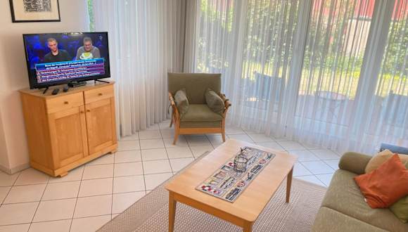 Die Ferienwohnung umfasst ein Schlafzimmer, ein Wohnzimmer sowie eine voll ausgestattete Küche mit Kühlschrank und Kaffeemaschine. Das Badezimmer ist mit einer Dusche und einem Haartrockner ausgestattet. Handtücher und Bettwäsche werden bereitgestellt.