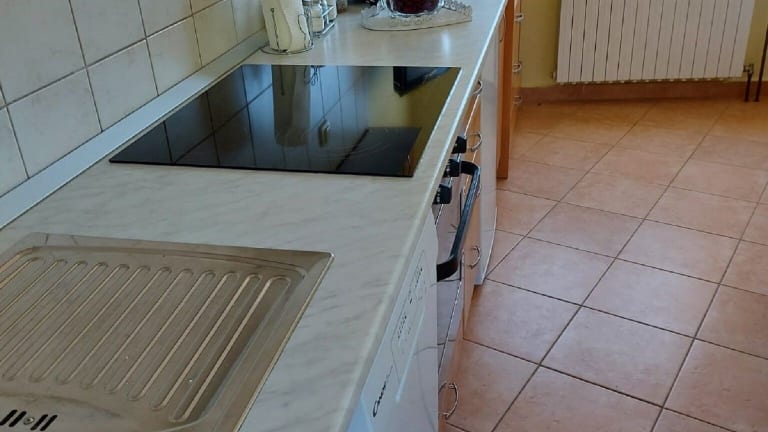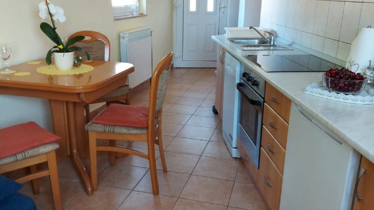 Die Ferienwohnung enthält eine voll ausgestattete Küche, in der die Selbstverpflegung möglich ist. Essbereich und Kühlschrank sind vorhanden, jedoch keine weiteren Informationen zur Verpflegung.