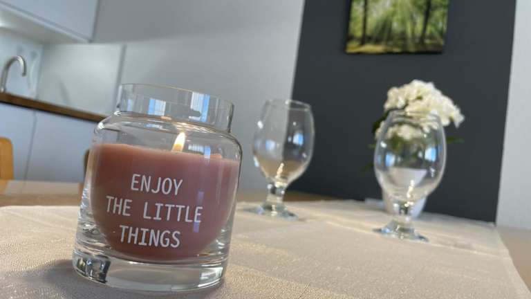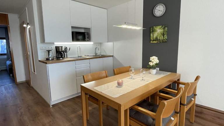 Das Apartment besteht aus einem Schlafzimmer, einem Wohnzimmer und einer voll ausgestatteten Küchenzeile mit Kühlschrank und Kaffeemaschine. Zur weiteren Ausstattung gehören ein Badezimmer mit Dusche, Haartrockner und ein TV mit Satellitenkanälen. Zudem steht den Gästen ein Balkon zur Verfügung.