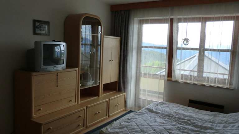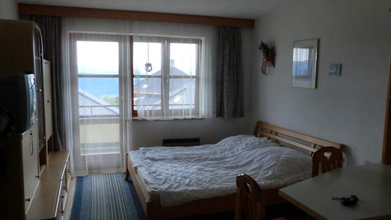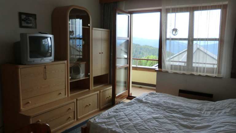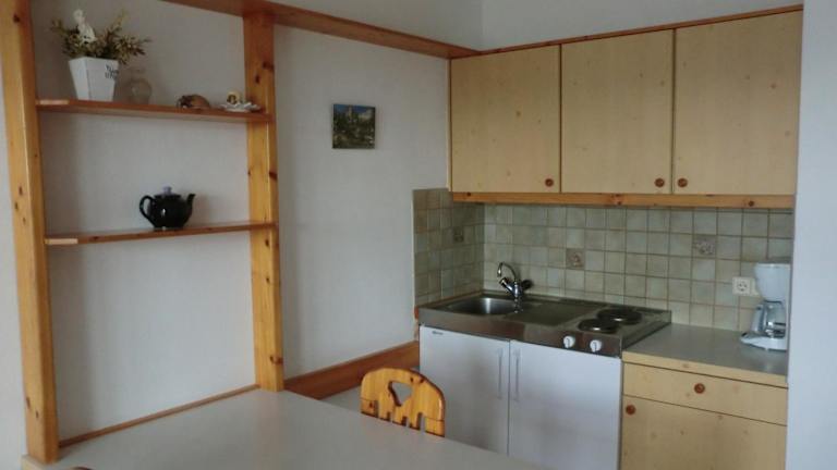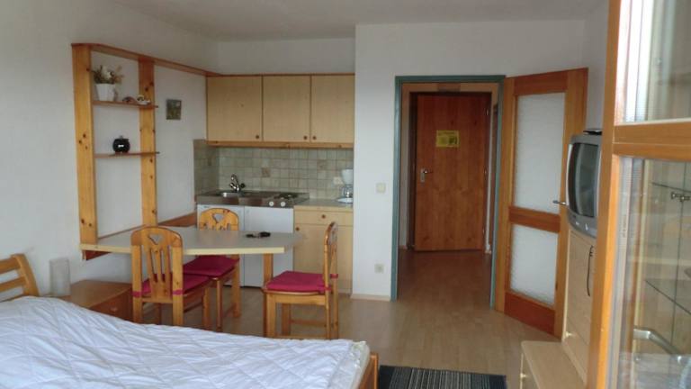 Das Apartment verfügt über ein gemütliches Schlafzimmer, eine Küchenzeile mit Kühlschrank und Kochfeld sowie ein Badezimmer mit Dusche. Handtücher und Bettwäsche werden gestellt, damit Sie sich wie zu Hause fühlen können. Der Balkon bietet einen herrlichen Blick auf die Berge und lädt zum Entspannen ein.