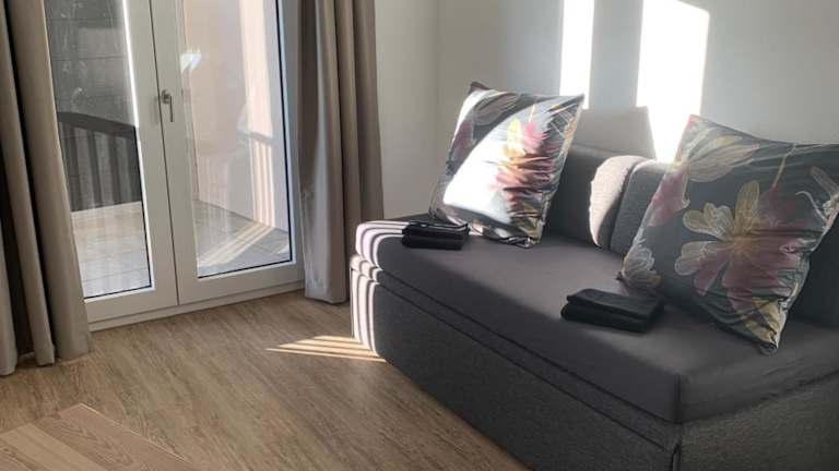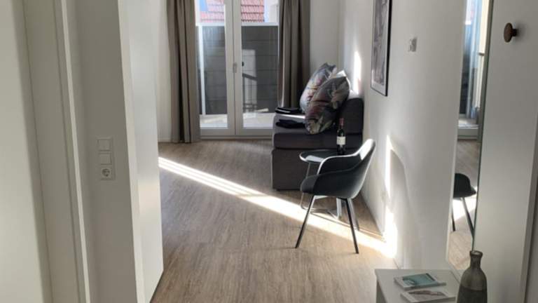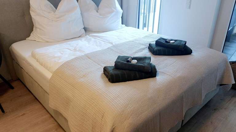 Die Ferienwohnung beinhaltet ein Schlafzimmer, ein Wohnzimmer sowie eine voll ausgestattete Küchenzeile mit Kühlschrank und Kaffeemaschine. Ein Badezimmer mit Dusche und kostenlosen Pflegeprodukten ist ebenfalls vorhanden. Handtücher und Bettwäsche werden bereitgestellt.