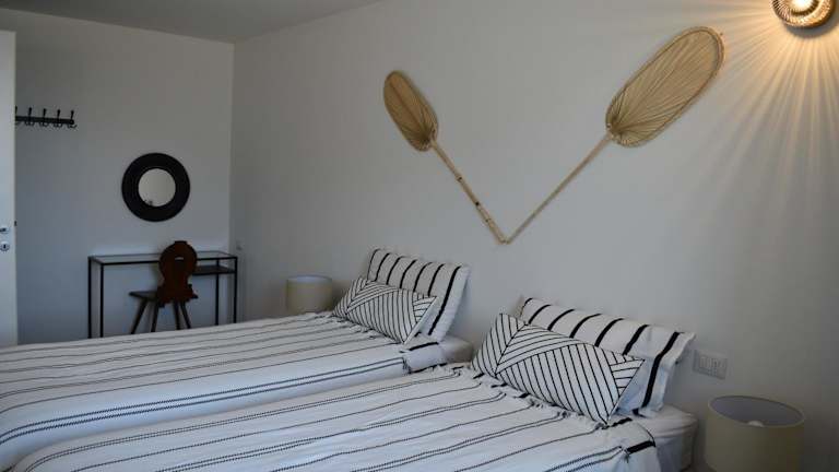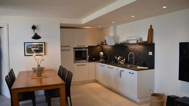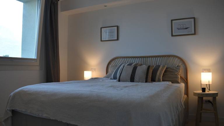 Die Ferienwohnung umfasst ein Wohnzimmer mit Sitz- und Essbereich, zwei Schlafzimmer und ein Badezimmer, das mit einem Bidet und einer Dusche ausgestattet ist. Handtücher und Bettwäsche werden bereitgestellt. Ein Blu-ray-Player ist ebenfalls Teil der Ausstattung.