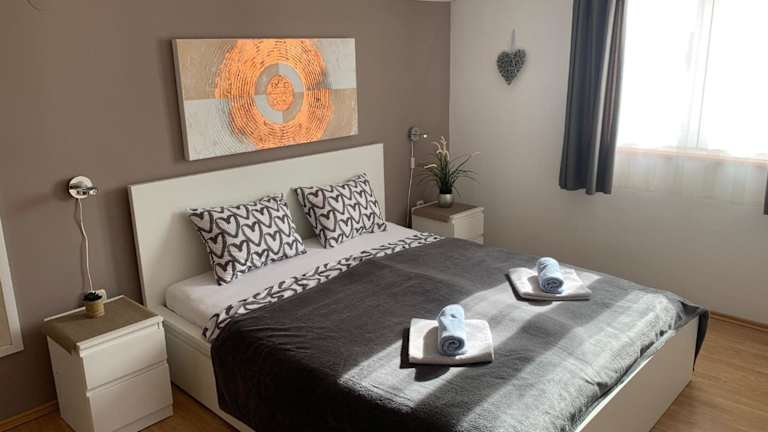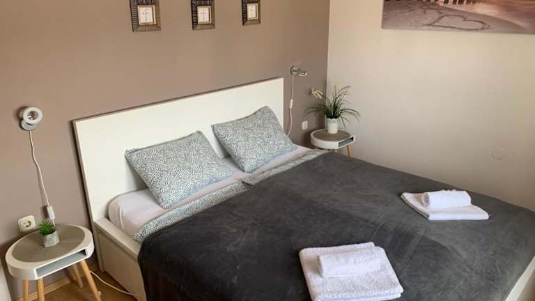 Die Ferienwohnung besteht aus 2 Schlafzimmern, einem Wohnzimmer, einer voll ausgestatteten Küche mit Kühlschrank und Kaffeemaschine sowie einem Badezimmer mit Dusche und Haartrockner. Handtücher und Bettwäsche werden bereitgestellt und die Unterkunft ist klimatisiert.
