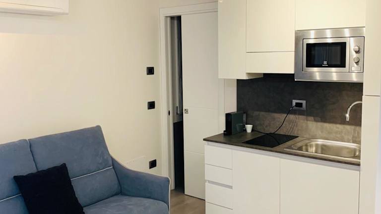 Die Ferienwohnung besteht aus einem Schlafzimmer und einem Wohnzimmer. Zur Ausstattung gehören eine voll ausgestattete Küche mit Kühlschrank und Kaffeemaschine sowie ein Badezimmer mit Bidet und Dusche. Ein Flachbild-TV mit Satellitenkanälen ist ebenfalls vorhanden.