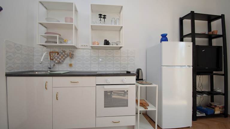 Die Ferienwohnung ist mit einer Küche ausgestattet, die über einen Kühlschrank, einen Ofen, eine Herdplatte, eine Kaffeemaschine und einen Wasserkocher verfügt. Es sind keine speziellen Verpflegungsmöglichkeiten angegeben.