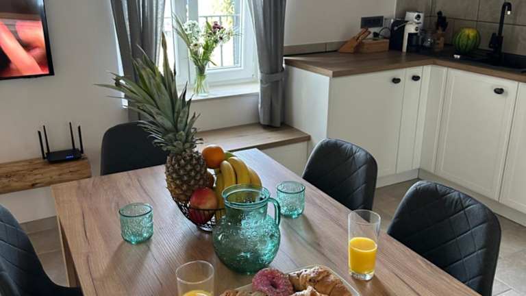 Die Ferienwohnung bietet Platz für bis zu 4 Personen und ist mit 2 Schlafzimmern, einem Wohnzimmer, einer voll ausgestatteten Küche mit Kühlschrank und Kaffeemaschine sowie einem Badezimmer mit Dusche und kostenlosen Pflegeprodukten ausgestattet. Handtücher und Bettwäsche sind verfügbar.