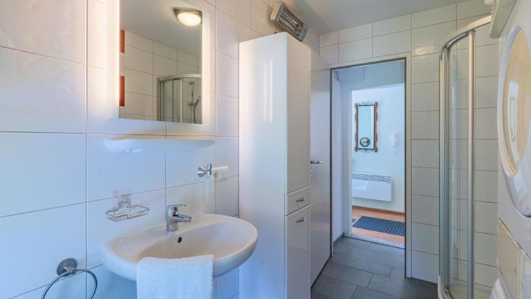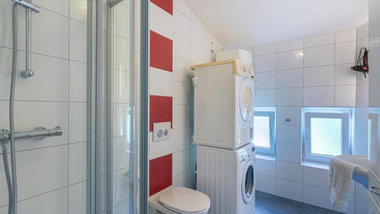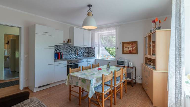Die Ferienwohnung umfasst eine gut ausgestattete Küche mit Kühlschrank, Geschirrspüler und Ofen, die Selbstverpflegung ermöglicht.