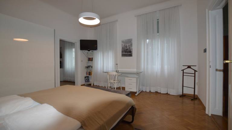 Das Apartment verfügt über ein Wohnzimmer mit Sitz- und Essbereich, eine Küche ausgestattet mit Kühlschrank, Geschirrspüler und Ofen sowie ein Schlafzimmer. Es sind zwei Badezimmer mit Bidet und Dusche vorhanden. Handtücher und Bettwäsche werden bereitgestellt.