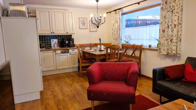 Die Ferienwohnung verfügt über ein Wohnzimmer, einen TV, eine gut ausgestattete Küche mit Kühlschrank und Geschirrspüler sowie ein Badezimmer mit Badewanne oder Dusche.