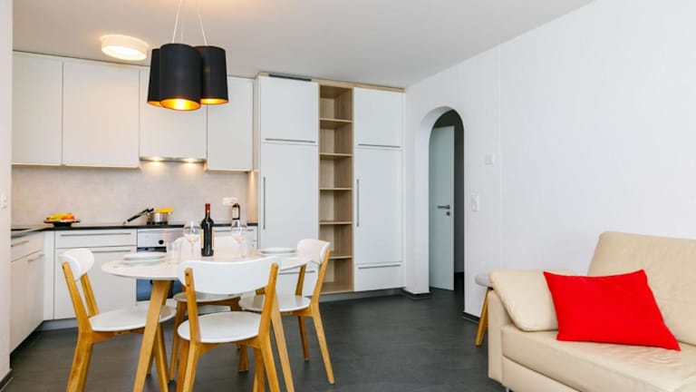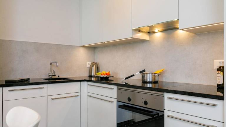 Die Ferienwohnung umfasst ein Schlafzimmer und ein Wohnzimmer, welches mit einem TV mit Kabelkanälen ausgestattet ist. Eine voll ausgestattete Küche mit Kühlschrank und Geschirrspüler sowie ein Badezimmer mit Dusche sind ebenfalls vorhanden.