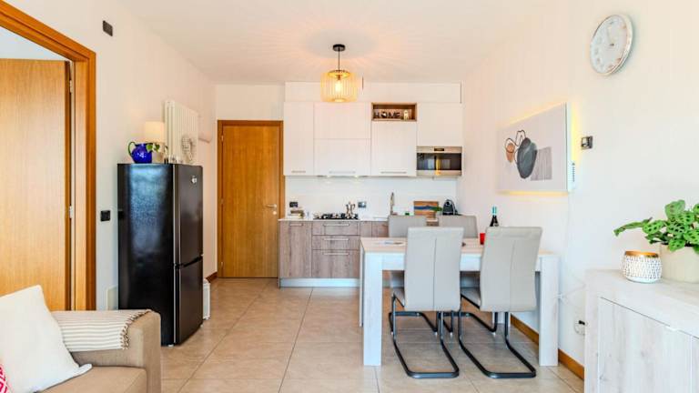Die Ferienwohnung hat ein Schlafzimmer, ein Wohnzimmer mit einem TV sowie eine gut ausgestattete Küche mit Kühlschrank und Geschirrspüler. Zudem gibt es ein Badezimmer mit Dusche.