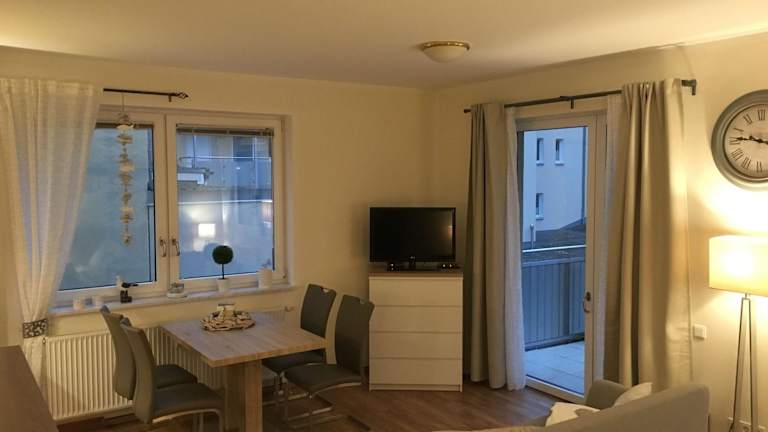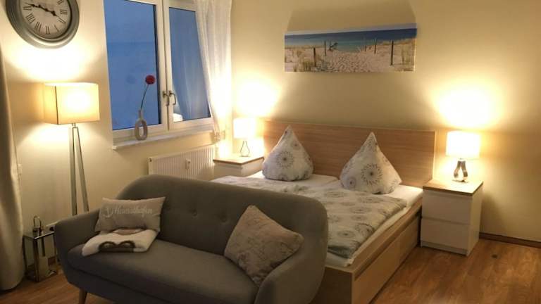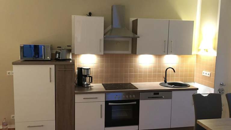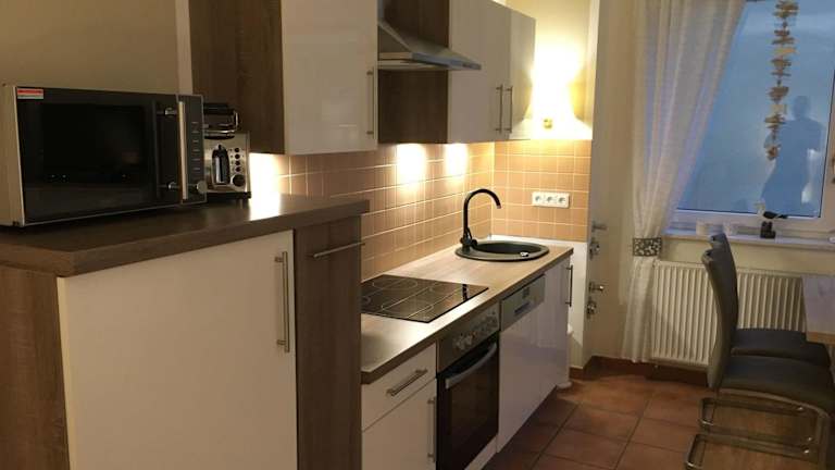 Die Ferienwohnung verfügt über ein Schlafzimmer, einen TV sowie eine gut ausgestattete Küchenzeile mit Kühlschrank und Geschirrspüler. Ein Badezimmer mit Dusche ist ebenfalls vorhanden.