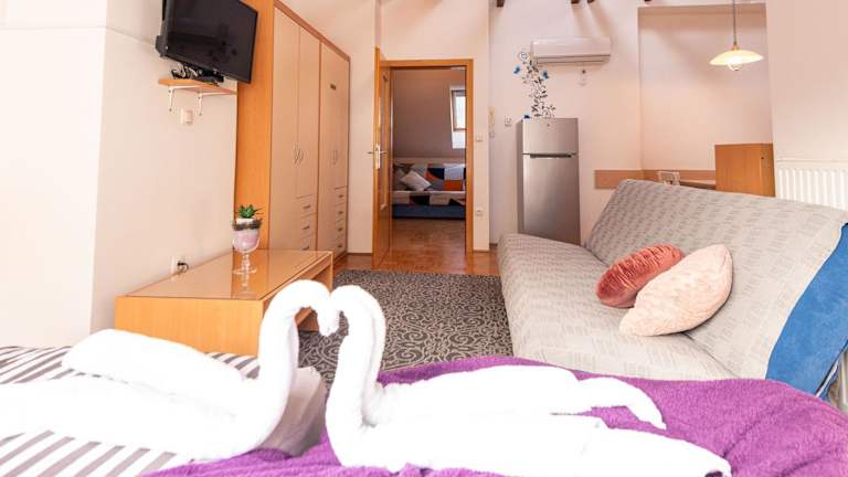 Die klimatisierten Unterkünfte im Apartment Stella bieten allen Komfort, den Sie für einen entspannten Aufenthalt benötigen. Jede Wohneinheit verfügt über eine voll ausgestattete Küche mit einem Esstisch, wo Sie Ihre Mahlzeiten zubereiten und genießen können. Ein Flachbild-Kabel-TV sorgt für Unterhaltung und das moderne Badezimmer ist mit einer Dusche, kostenfreien Pflegeprodukten und einem Haartrockner ausgestattet. Einige Unterkünfte verfügen über eine Terrasse oder einen Balkon mit Blick auf die Stadt oder den Pool.