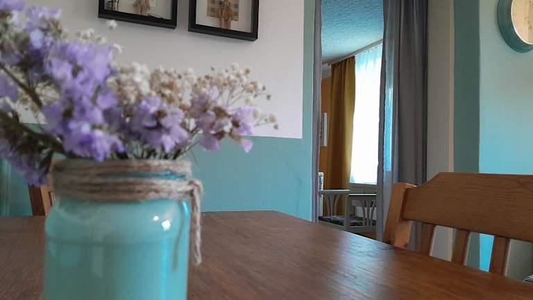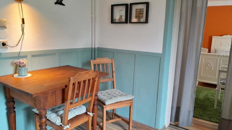 Das Apartment Süd besticht durch seine farbenfrohe und stilvolle Einrichtung. Es bietet eine Kombination aus modernen und antiken Elementen, die eine einladende Atmosphäre schaffen. Das Apartment verfügt über eine Terrasse, ein gemütliches Schlafzimmer, eine Wohnküche mit einem Essbereich und ein Badezimmer mit Dusche und WC. Handtücher und Bettwäsche werden gestellt, sodass Sie sich um nichts kümmern müssen.