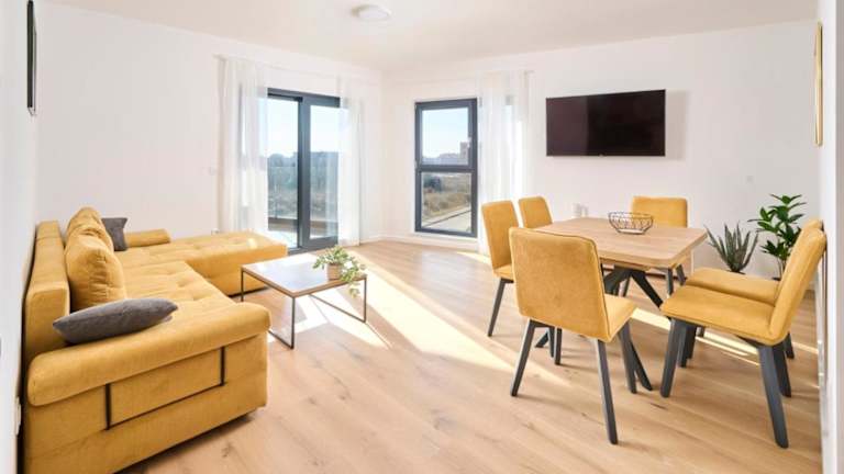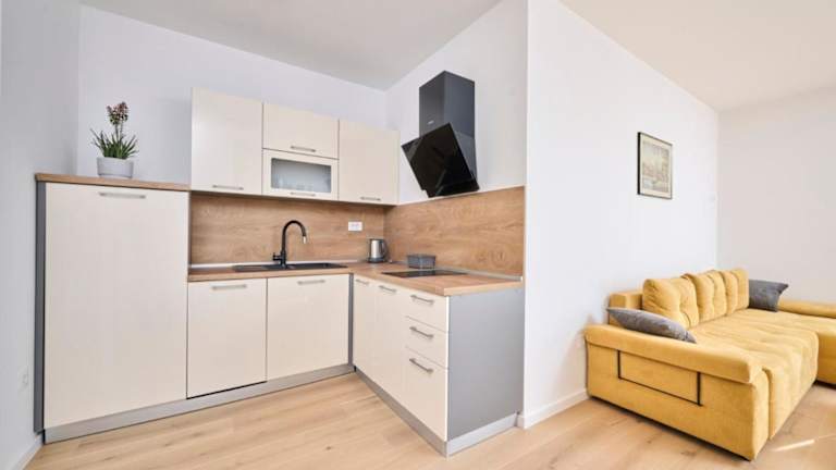 Die Ferienwohnung umfasst zwei Schlafzimmer, ein Wohnzimmer sowie eine voll ausgestattete Küche mit Kühlschrank und Wasserkocher. Zudem gibt es ein Badezimmer mit Dusche und Haartrockner. Handtücher und Bettwäsche werden bereitgestellt.