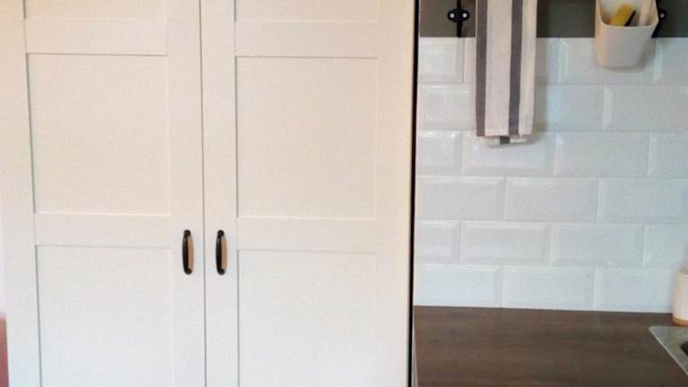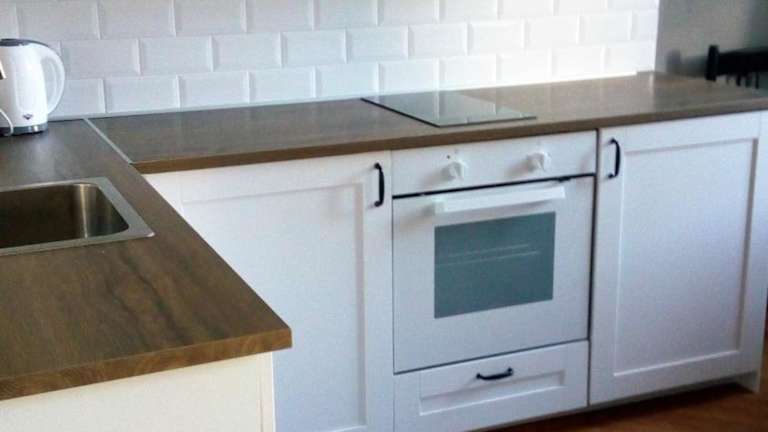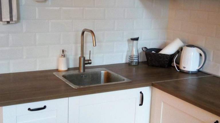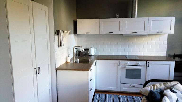 Die gut ausgestattete Küchenzeile bietet einen Kühlschrank und einen Ofen, was die Selbstversorgung ermöglicht.