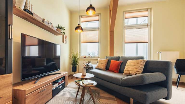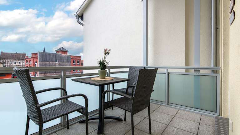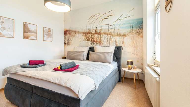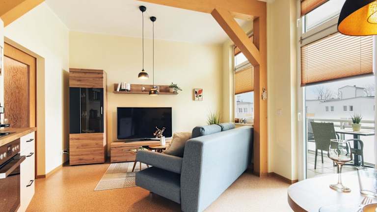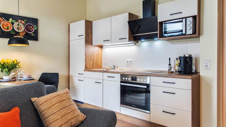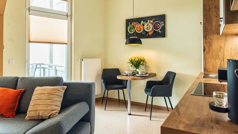 Die Ferienwohnung beinhaltet ein Schlafzimmer, ein Wohnzimmer sowie eine gut ausgestattete Küche. Der Balkon lädt zum Entspannen ein.