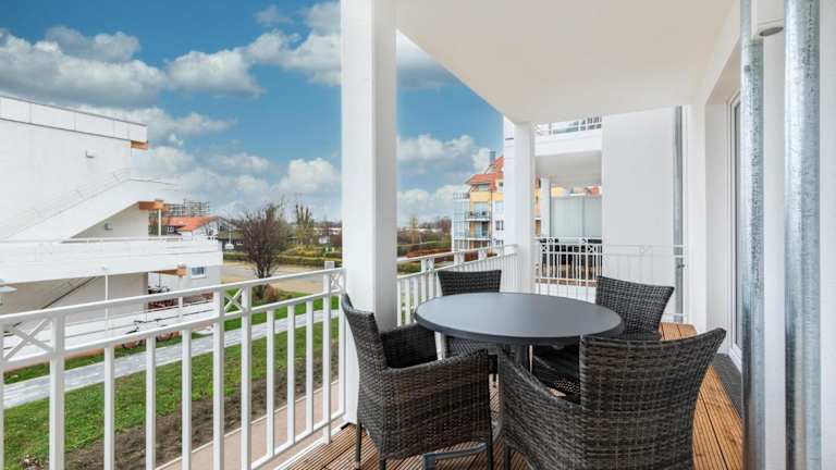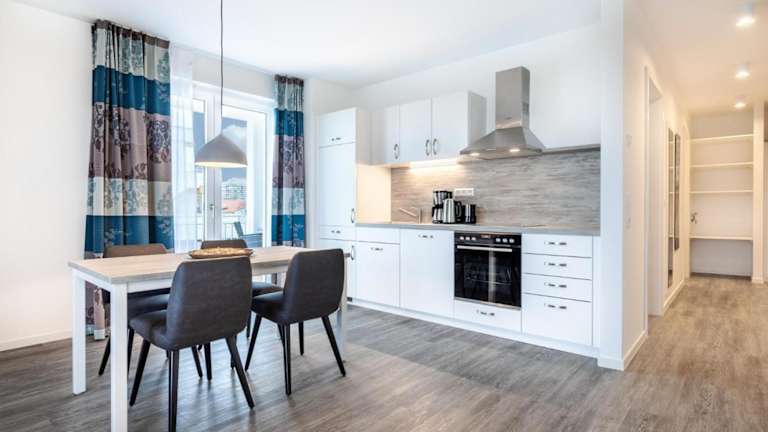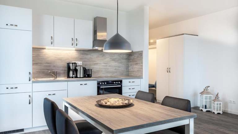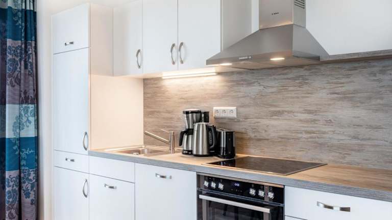 Die Ferienwohnung umfasst einen Balkon, ein Schlafzimmer, ein Wohnzimmer und eine gut ausgestattete Küche. Zur Ausstattung der Küche gehören ein Kühlschrank und ein Geschirrspüler. Des Weiteren ist die Wohnung mit einem Flachbild-TV ausgestattet.