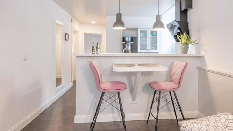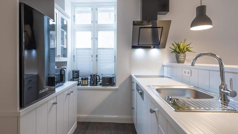 Die Ferienwohnung umfasst eine voll ausgestattete Küche, die mit einem Kühlschrank und Geschirrspüler ausgestattet ist.