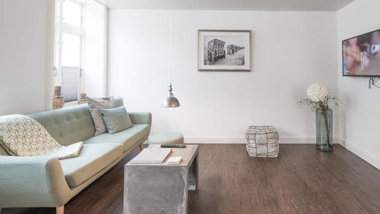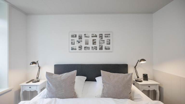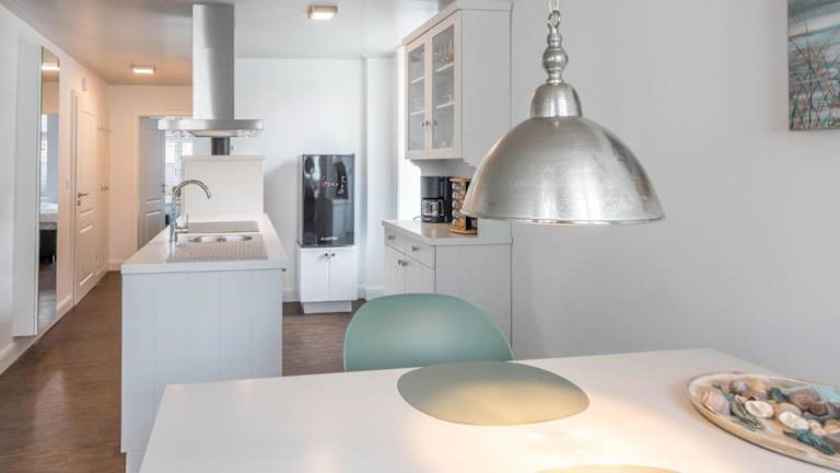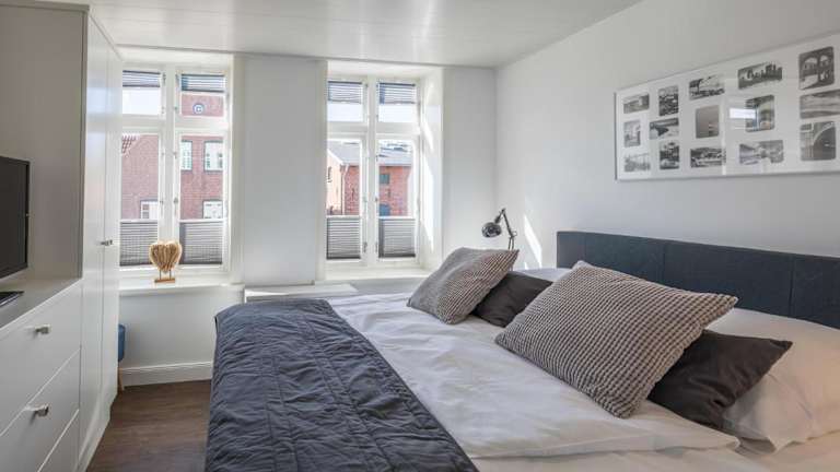 Die Ferienwohnung verfügt über ein Schlafzimmer, einen Fernseher sowie eine Küche, die mit einem Kühlschrank und einem Geschirrspüler ausgestattet ist.