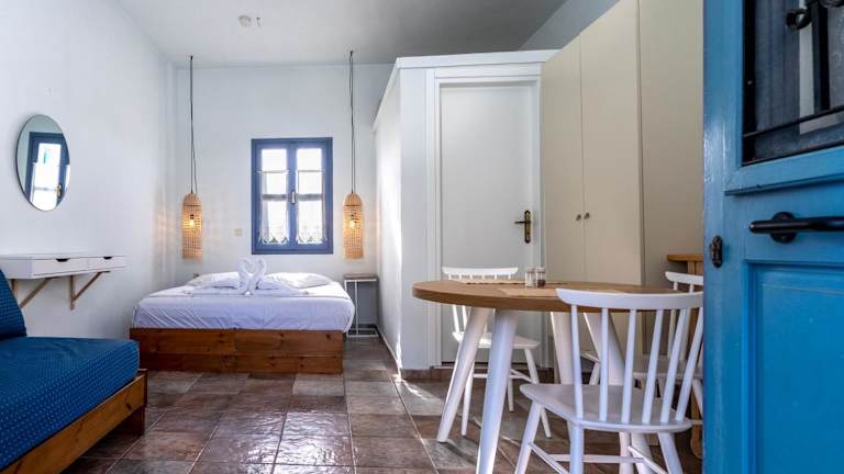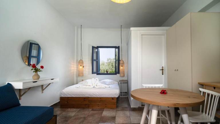 Die Studios der Aeolus pool apts sind geschmackvoll dekoriert und verfügen über Fliesenböden, Betten mit Baldachin und weiß getünchte Wände. Jedes Studio verfügt über eine Küchenzeile mit einem Kühlschrank und Küchengeschirr sowie ein eigenes Badezimmer mit einer Dusche. Vom Balkon aus haben Sie einen schönen Blick auf den Pool und den Garten.