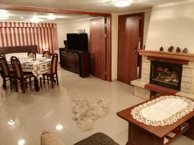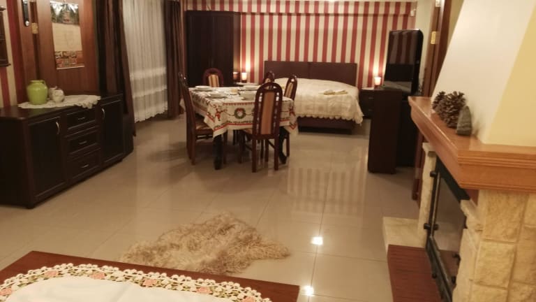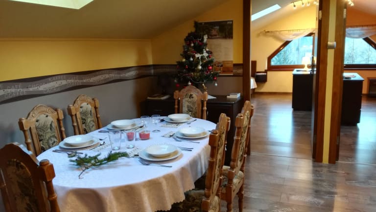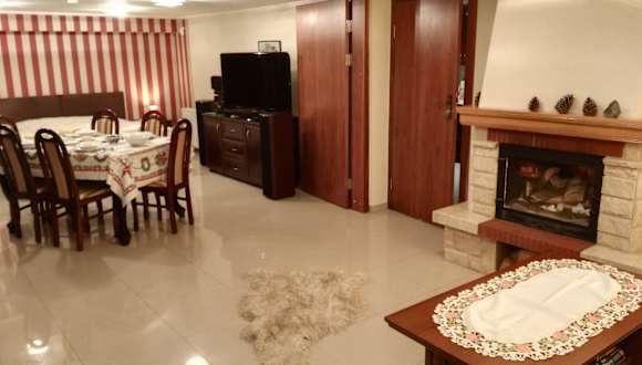 Das Apartmenthaus „ Bażancia Chatka” liegt an einem sonnigen, südlichen Bergabhang 430 m ü. M . Dieser Berg wurde von den dortigen Bewohnern „ Königlicher Berg" genannt. Das ganze Haus besteht aus vier Stockwerken. Im obersten Stock befindet sich das malerische Apartment mit vier Dachfenster und zwei Fenster von der Südseite. Im Apartment sind : zwei Dreibettzimmer , in jedem Zimmer steht ein bequemes Doppelbett 200x180 cm und ein Zustellbett 90 cm breit , ein Wohnzimmer mit einer komplett ausgestatteten Küchenzeile und einem Schlafsofa für zwei Personen und ein modernes Bad (auch mit Dachfenster).Das Apartment ist vorgesehen für den Aufenthalt von acht Personen. Man schließt die Wohnungstür ab. Zimmer mit hohem Standard bieten Hotelfernsehen, TV-LCD und kostenfreies WLAN. Die elegante Einrichtung vermittelt das Gefühl von Ruhe und Entspannung, ideal für die Familien mit den Kindern und Jugendlichen sowie für gemeinsam reisenden Bekannten. Im dritten Stock befindet sich Drei- Zimmer- Apartment für neun Personen. In jedem Zimmer steht ein großes Doppelbett und bequemes Zustellbett. Zwei von den Zimmern verfügen über Badezimmer und Balkon auf Südseite, das dritte Zimmer ist auch für drei Personen , mit dem Zugang zum großen Bad. Im Bad befindet sich eine Waschmaschine, sowie eine Babybadewanne und ein Wickeltisch. In diesem Stock ist auch die größte Küche , in der man einen Geschirrspüler, einen Backofen und einen großen Tisch finden kann. Zimmer mit hohem Standard bieten Hotelfernsehen, TV-LCD und kostenfreies WLAN. Im zweiten Stock befindet sich auch Drei- Zimmer- Apartment. Alle Zimmer sind Dreibettzimmer mit einem Bad und einem Balkon auf Südseite. Dieses Apartment bietet bequeme Küche und ist vorgesehen für den Aufenthalt von acht Personen. Man schließt die Wohnungstür ab. Zimmer mit hohem Standard bieten Hotelfernsehen, TV-LCD und kostenfreies WLAN. Im niedrigsten Stock ist ein großes Wohnzimmer mit Kamin, einem Ausziehtisch und zwei Ecksofas (Sitzfunktion und Schlaffunktion) RTV-Geräte, TV-LCD 46". Zwei große Terrassenfenster mit Ausgang zur Südterrasse . Hier ist eine Küchenzeile sowie ein Bad mit Dusche, Waschbecken und WC vorhanden. Geschlossener , bewachter Parkplatz, Grillplatz mit Grillgeräte, Skiraum und Fahrradraum sind im Preis inbegriffen. Wir laden herzlich ein !