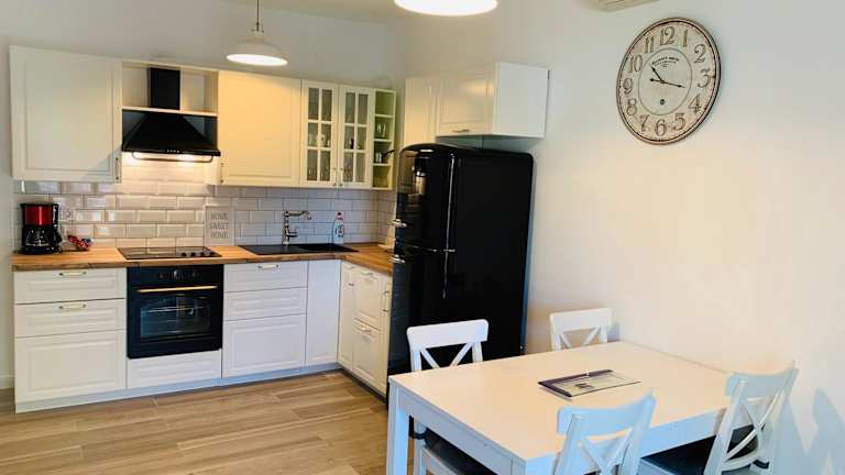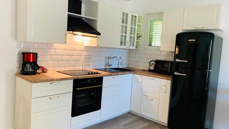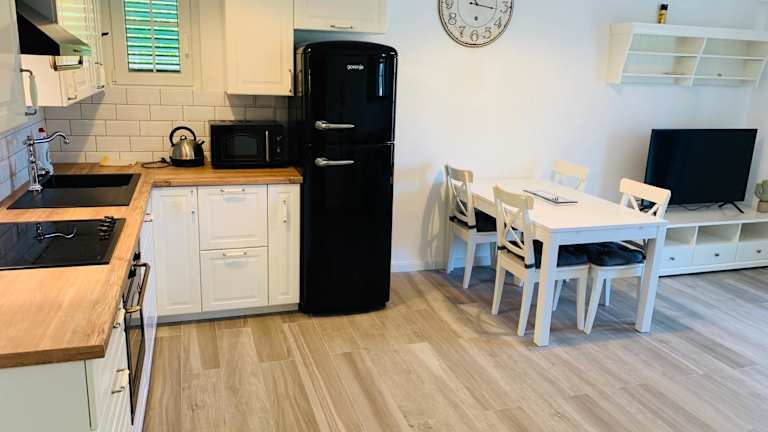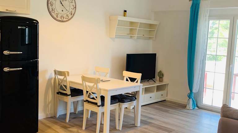 Das Apartment in den Apartments Biba verfügt über 3 Schlafzimmer und 1 Badezimmer. Es ist klimatisiert und bietet eine voll ausgestattete Küche, einen Essbereich und einen Flachbild-TV. Bettwäsche und Handtücher werden gestellt. Vom Apartment aus haben Sie Zugang zu einer Terrasse mit Blick auf den Garten.