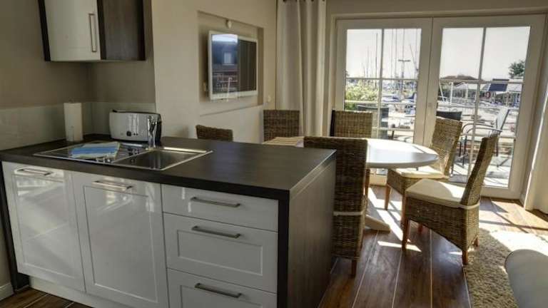 Die HafenResidenz Fehmarn bietet helle und moderne Apartments, die im Jahr 2011 neu erbaut wurden. Die Apartments verfügen über ein separates Schlafzimmer sowie ein kombiniertes Wohn-/Esszimmer mit einem gemütlichen Sofa und einem großzügigen Esstisch. Die voll ausgestattete Küche ermöglicht es Ihnen, Ihre Mahlzeiten bequem selbst zuzubereiten. Alle Apartments verfügen über einen Balkon oder eine Terrasse, auf denen Sie die frische Meeresluft genießen können. Einige Apartments sind sogar mit einer eigenen Sauna ausgestattet. Zur weiteren Ausstattung gehören ein 42-Zoll-Flachbild-TV, ein DVD/CD-Player und eine iPod-Dockingstation. Die Badezimmer sind mit einer ebenerdigen Dusche, einem Haartrockner und Fußbodenheizung ausgestattet.