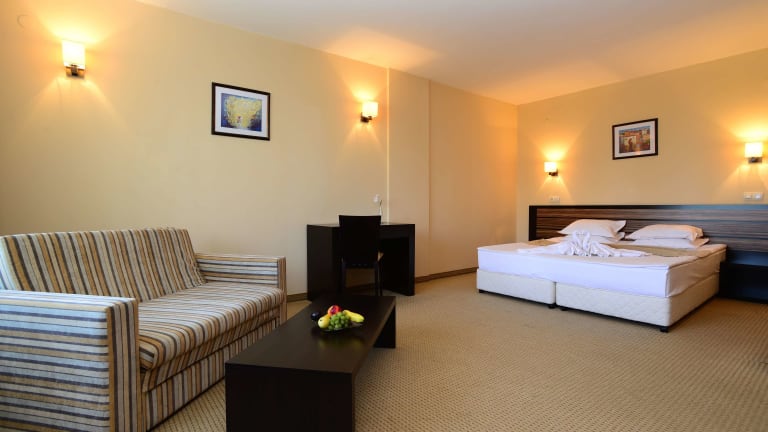 Die 58 Zimmer des Hotels sind auf fünf Etagen verteilt und über einen Aufzug erreichbar. Die Zimmer sind mit Heizung, Balkon oder Terrasse, Doppelbetten, Minibar, Schreibtisch, Telefon, Flachbildfernseher mit Satellitenempfang und kostenlosem WLAN ausgestattet. Die Badezimmer verfügen über Duschen und Badewannen, einen Haartrockner, Bademäntel, Hausschuhe und kostenlose Pflegeprodukte.