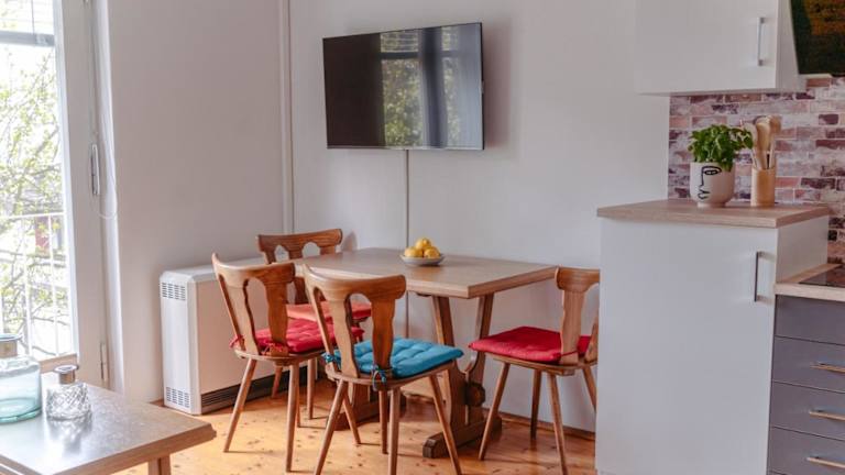 Die Wohneinheiten sind mit Parkettboden ausgestattet und bieten eine moderne und gemütliche Atmosphäre. Jedes Apartment verfügt über eine voll ausgestattete Küchenzeile, einen Flachbild-TV mit Satellitenkanälen und ein eigenes Badezimmer mit Dusche sowie Haartrockner. Zu den weiteren Annehmlichkeiten zählen Geschirrspüler, Herdplatte, Toaster, Kaffeemaschine und Wasserkocher.