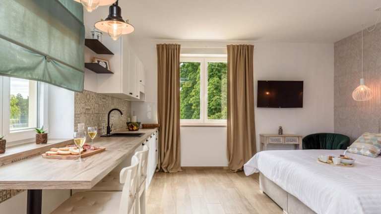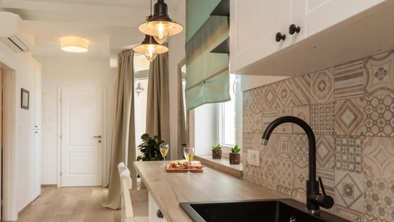 Die Unterkunft verfügt über eine Veranda oder einen Patio mit Stadtblick. Die Wohnungen sind mit einem Sitzbereich, einem Satelliten-Flachbild-TV und einer voll ausgestatteten Küche ausgestattet, die einen Kühlschrank, einen Geschirrspüler, eine Herdplatte, einen Toaster und einen Wasserkocher umfasst. Jedes Apartment verfügt über ein eigenes Badezimmer mit einer Dusche und kostenlosen Pflegeprodukten.