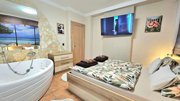 Das Apartman Siesta Bük bietet eine Vielzahl von Freizeitmöglichkeiten für seine Gäste. Entspannen Sie im Whirlpool oder in der Sauna und genießen Sie die Ruhe und Erholung. Im Garten des Hotels finden Sie einen Grillplatz und einen Kinderspielplatz. Ein kostenloser Fahrradverleih steht Ihnen ebenfalls zur Verfügung, um die Umgebung zu erkunden. Ein Golfplatz ist nur 3 km entfernt, falls Sie eine Runde Golf spielen möchten.