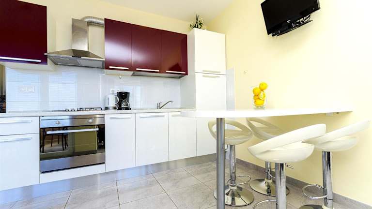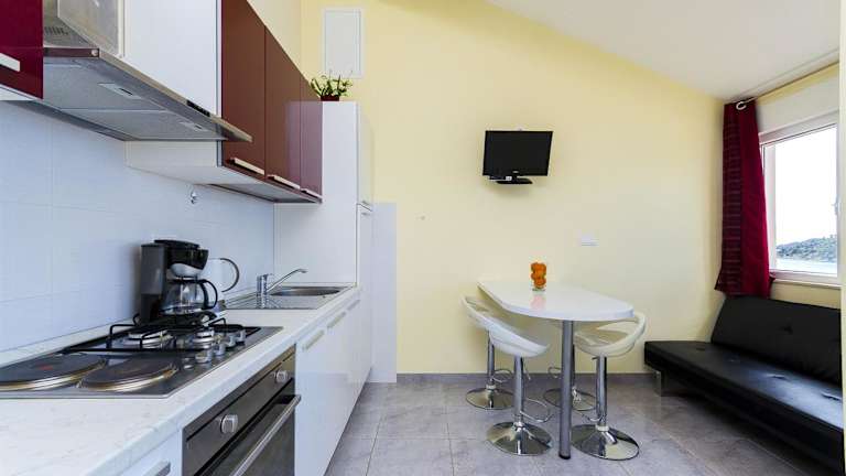 Die klimatisierten Apartments sind mit einer voll ausgestatteten Küche ausgestattet, welche über einen Kühlschrank, eine Kaffeemaschine, einen Ofen, eine Herdplatte, einen Toaster und einen Wasserkocher verfügt.