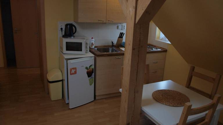 Die Wohneinheiten der Apartments Viktoria Klinovec verfügen über eine voll ausgestattete Küche mit Kühlschrank, Wasserkocher und Mikrowelle sowie ein eigenes Badezimmer mit Dusche und Hausschuhen.