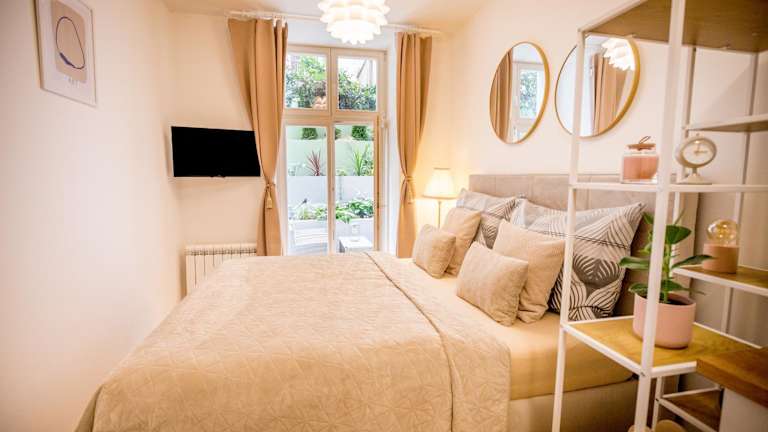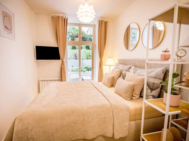 Die Ferienwohnung umfasst 1 Schlafzimmer und 1 Badezimmer. Die Ausstattung beinhaltet Bettwäsche, Handtücher, einen Flachbild-TV mit Satellitenkanälen, einen Essbereich sowie eine voll ausgestattete Küche. Eine Terrasse mit Gartenblick ist ebenfalls vorhanden.