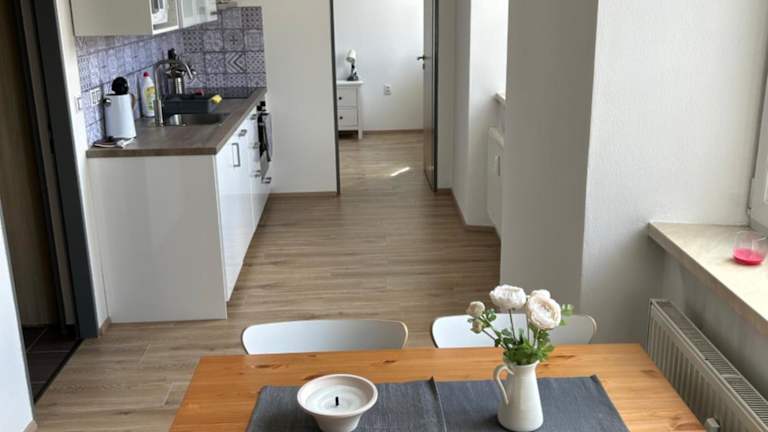 Die Ferienwohnung verfügt über ein Schlafzimmer, ein Wohnzimmer mit Flachbild-TV, eine voll ausgestattete Küche mit Kühlschrank und Ofen sowie ein Badezimmer mit Badewanne. Handtücher und Bettwäsche werden bereitgestellt. Zudem gibt es eine Terrasse.